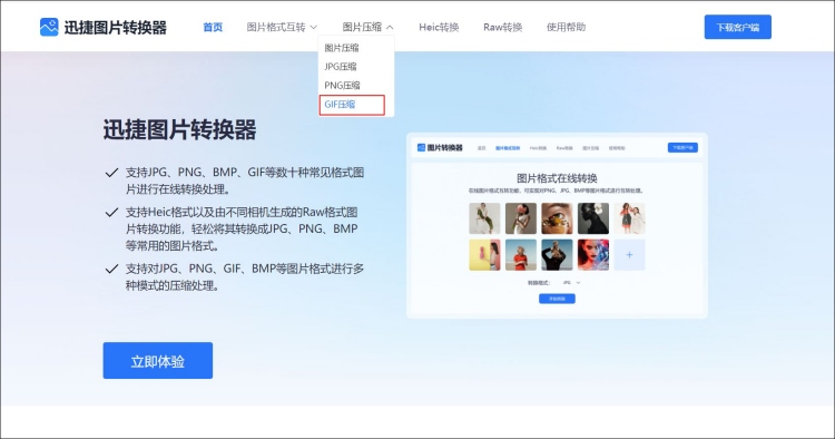 以迅捷图片转换器为例,在工具的首页选择【GIF压缩】即可将GIF动图添加到工具中进行压缩大小操作。